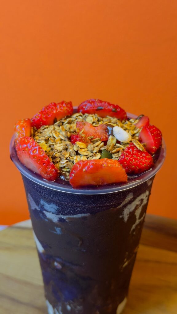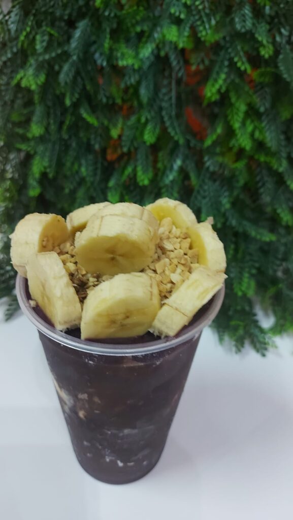 Açaí tradicional com Guaraná, sabor equilibrado e textura cremosa, com Creme de Avelã, Granola e Banana